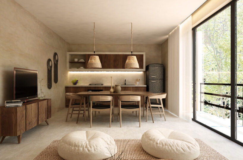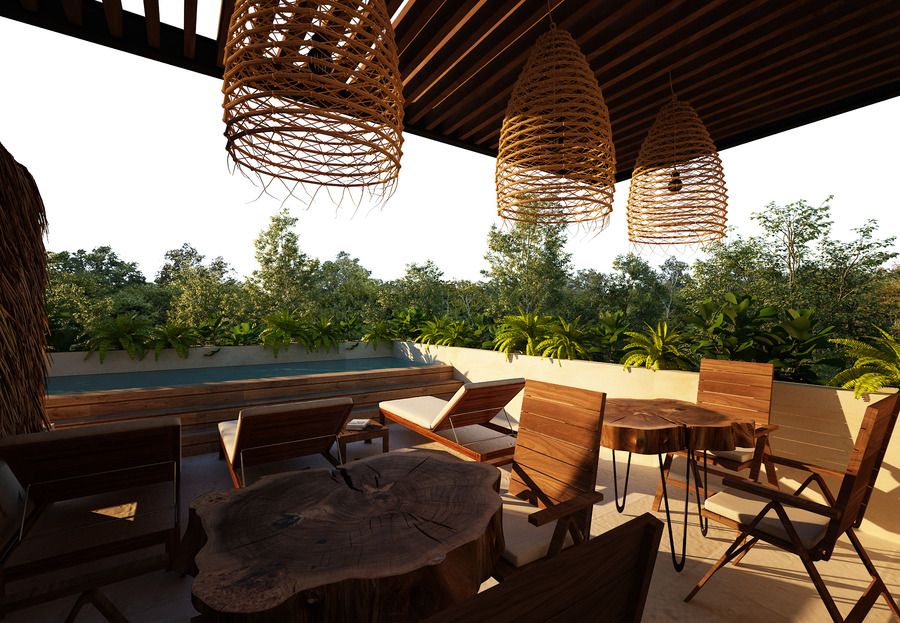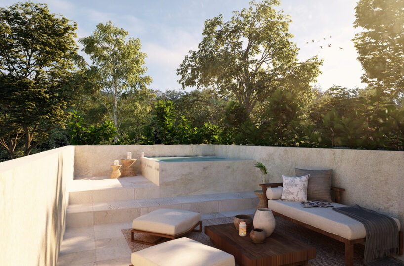 - Estudio: 35 m² – Área de estar, cocina, 1 recámara, 1 baño, sofá cama. Opcionales: jardín con plunge pool, terraza con vista a la selva o rooftop con plunge pool.