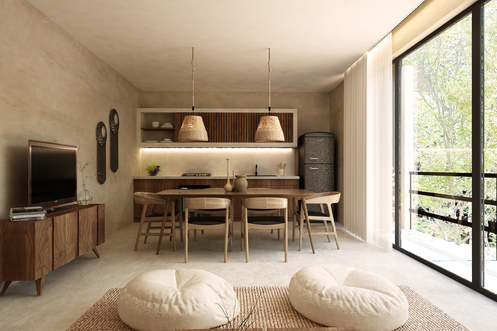 - Departamento de 1 Recámara: 61 m² – Recámara doble, baño, sala, cocina, sofá cama. Opcionales: jardín, terraza o rooftop con plunge pool.