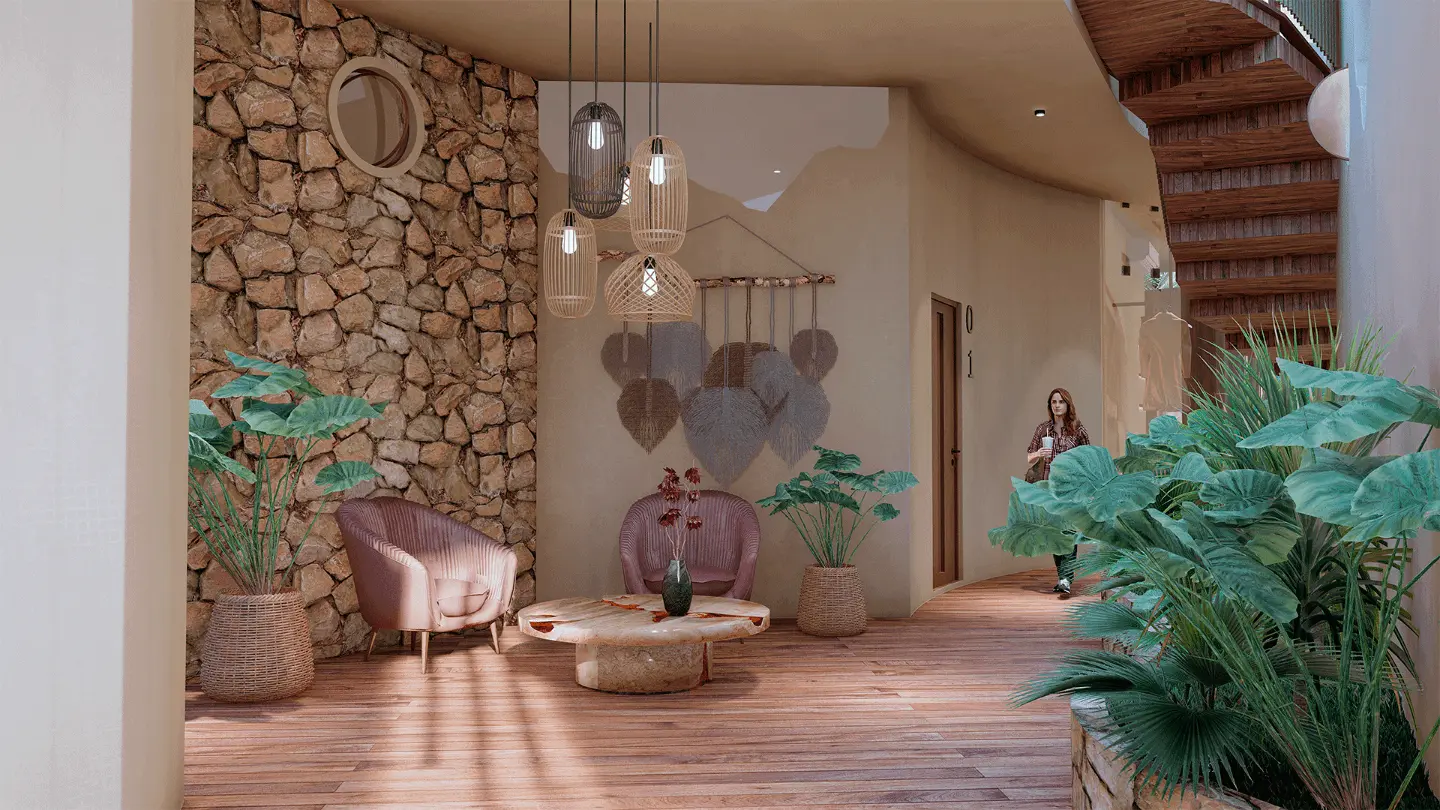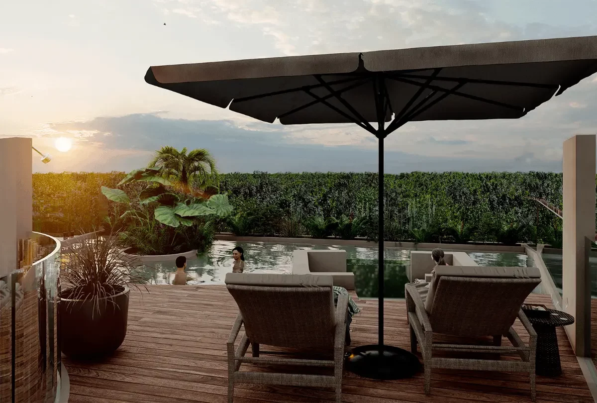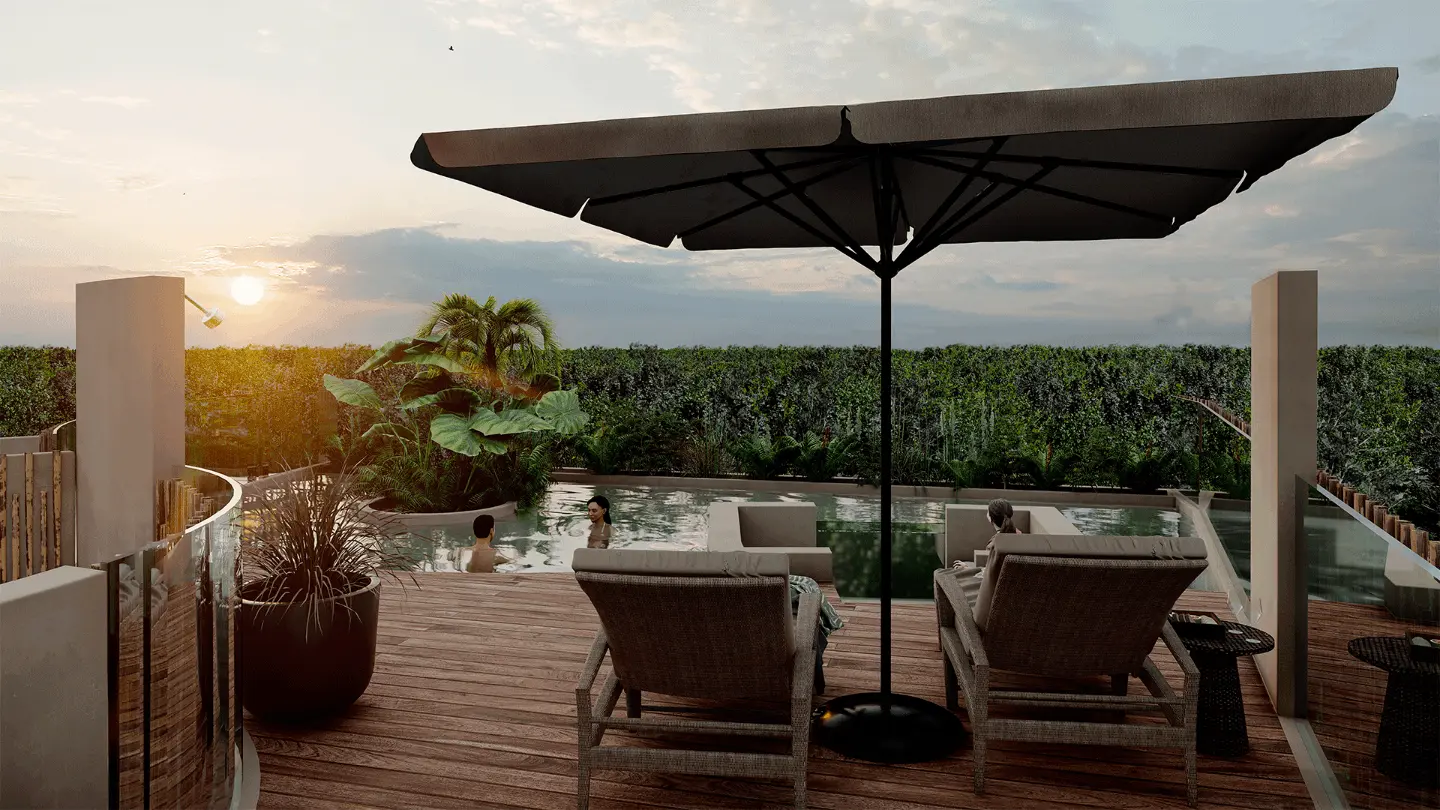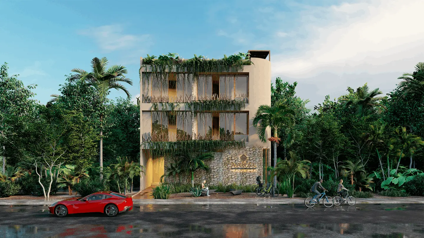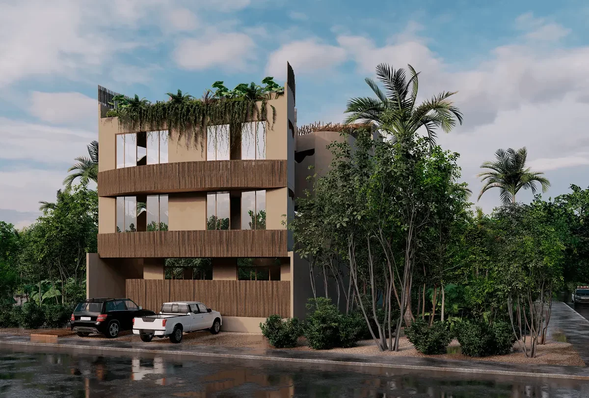 Aahal Tulum is a boutique development located in the Mayan jungle of Tulum, offering nine distinct apartment layouts. Each unit is designed around natural textures, local materials, and open green areas to promote sustainable living. The project is structured across three levels and topped with a social rooftop featuring a jungle-facing pool and gathering zones.