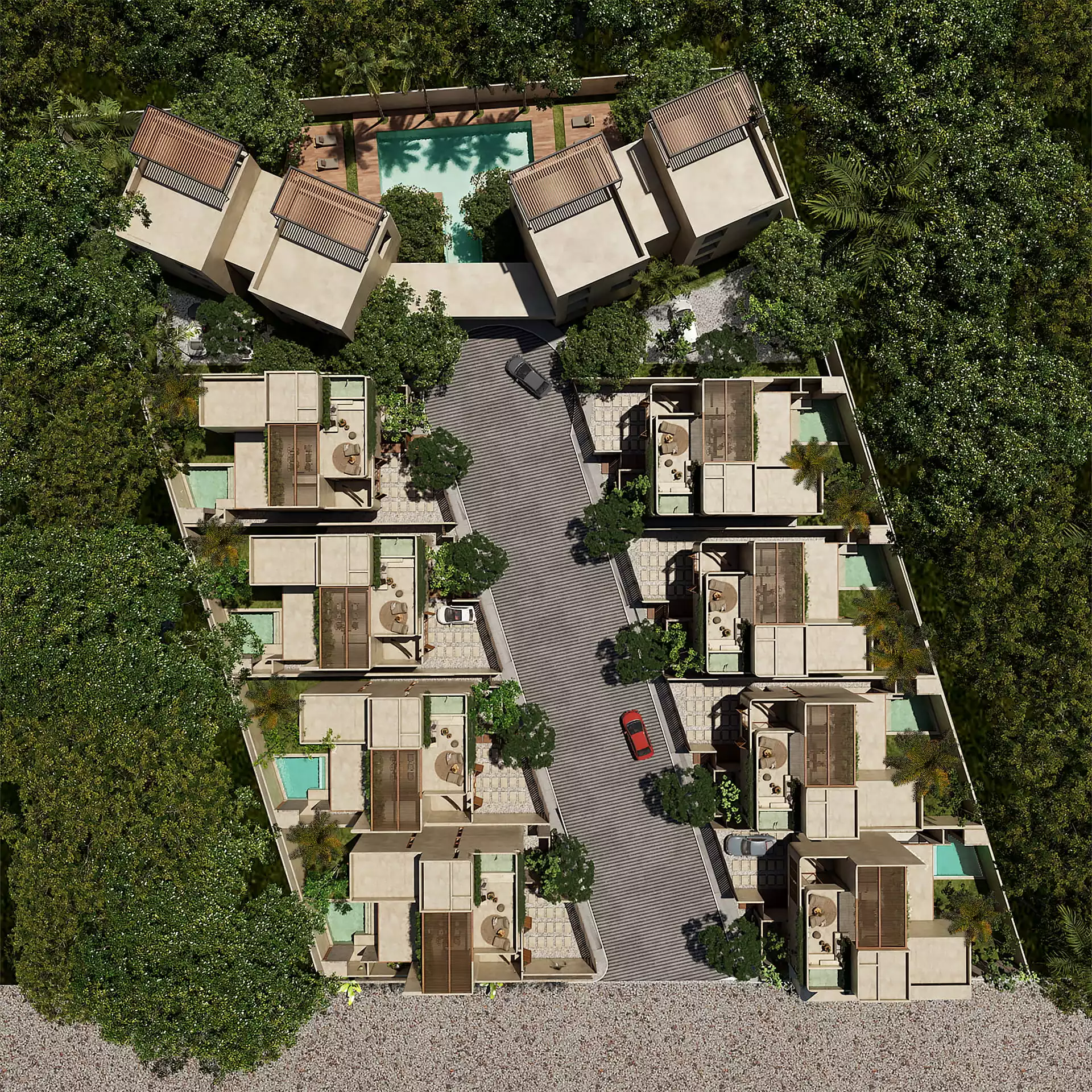 El Retiro Villas is a boutique residential community located in Tulum, featuring eight standalone homes and nine townhouses in a secured setting. Each villa includes a private pool, rooftop with jacuzzi, and spacious interiors designed for long-term living or flexible vacation rental use.