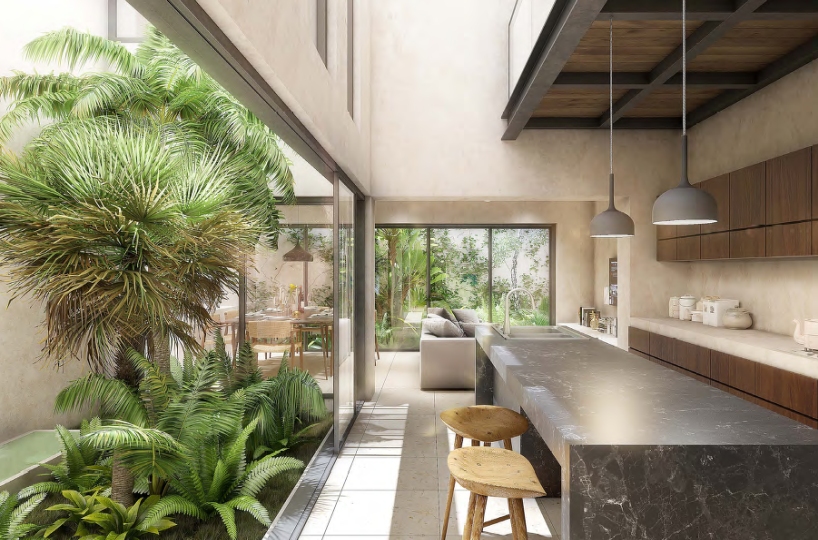 K’AAX, a new development located in the heart of Tulum, designed to blend eco-friendly living with contemporary architecture. This exclusive project offers a range of luxurious private villas and condominiums, each crafted with clean lines and appealing geometry that highlight its minimalist and modern design.
