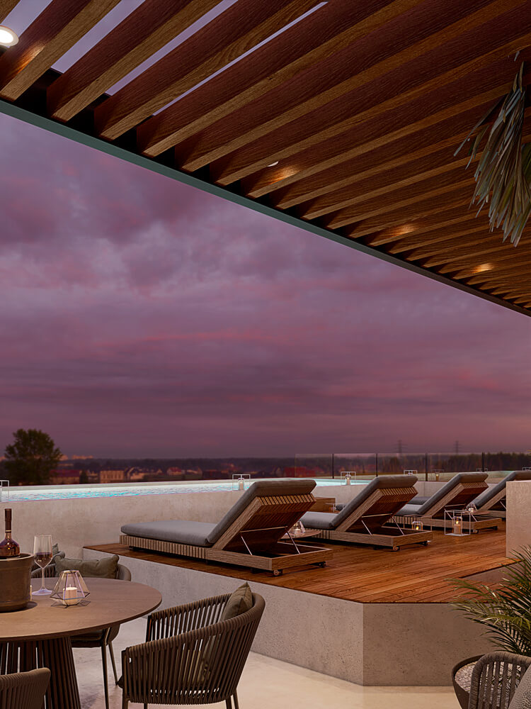 Residents can indulge in a variety of top-tier amenities that cater to both relaxation and an active lifestyle. The rooftop is a highlight, featuring a stunning panoramic view of the area, a refreshing swimming pool, a yoga space, a sunbathing deck, and an outdoor barâperfect for unwinding after a day in the city.
