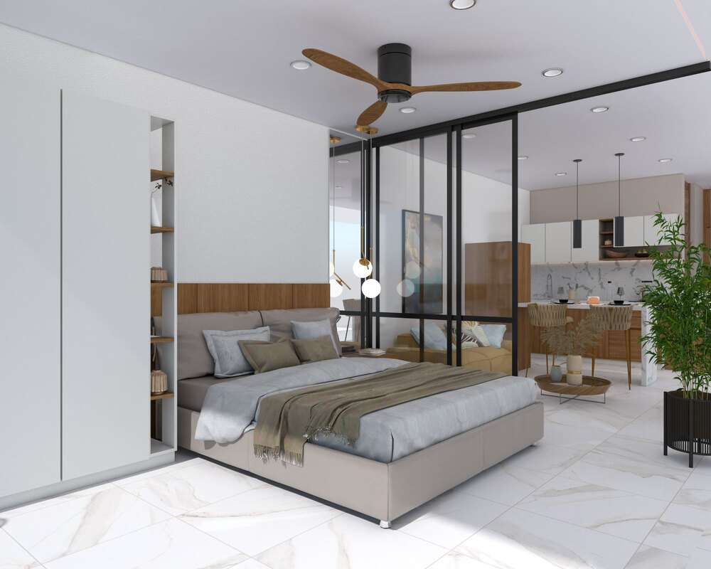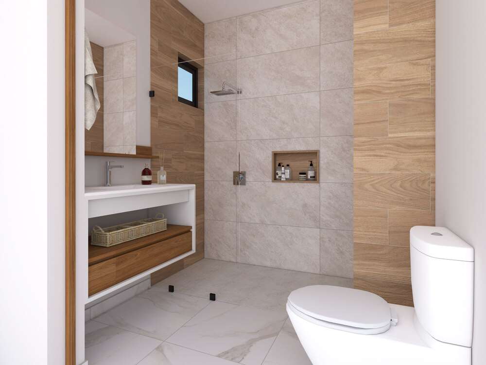 - Bathroom: Equipped with modern bathroom furniture including a sink and toilet, a drawer unit, a lighted mirror, and a glass shower enclosure.
