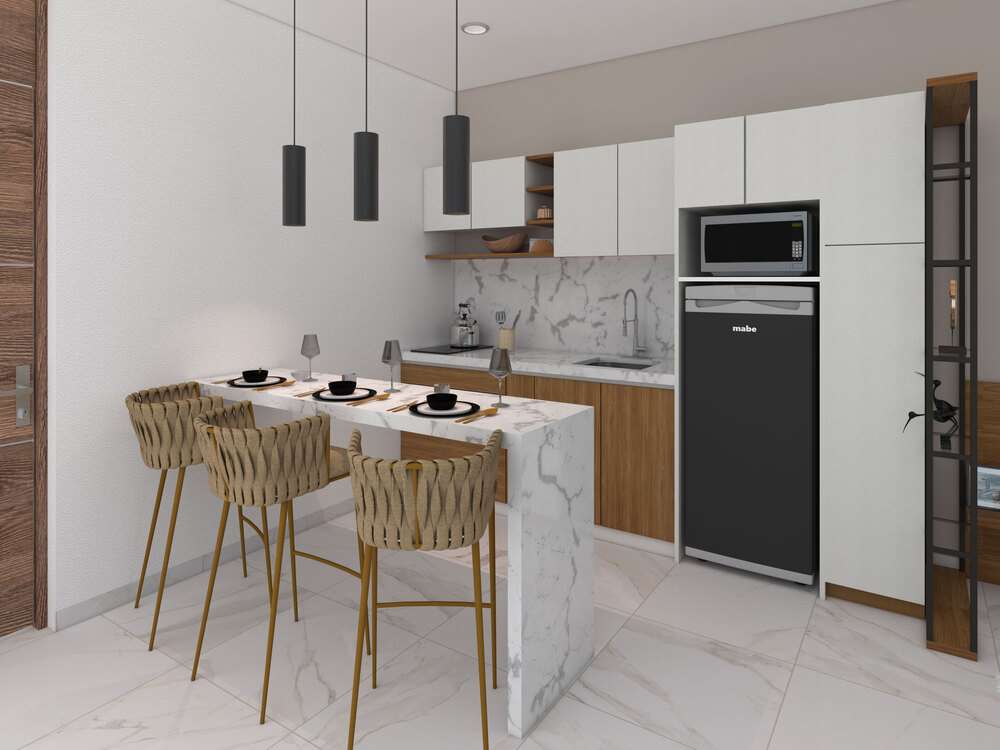 - Kitchen: Features include a modern integral kitchen in white wood and parota, a breakfast bar with two stools, microwave, range hood, and a 13 ft³ refrigerator.