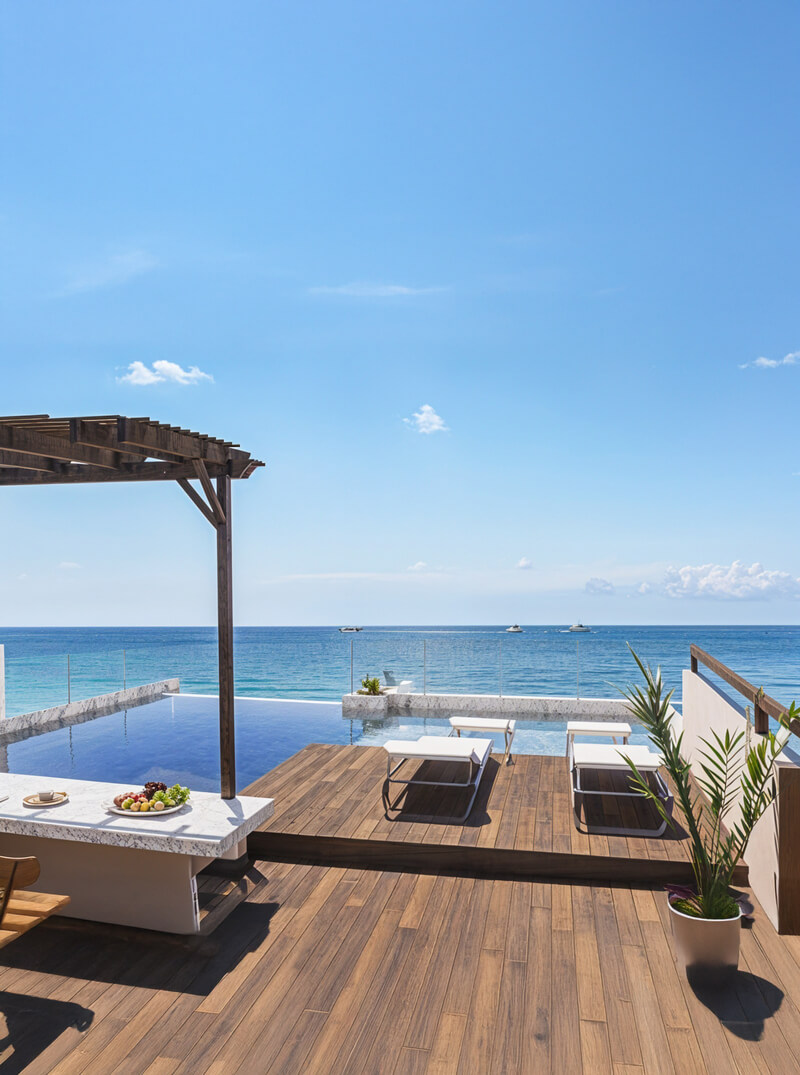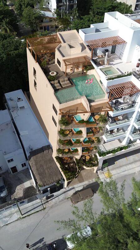 The pricing of Thea Puerto Morelos starts at $3,668,600 MXN. Thea is suited for residential use and vacation rental investment. All units include private outdoor space. Rooftop access available to upper-level residents.