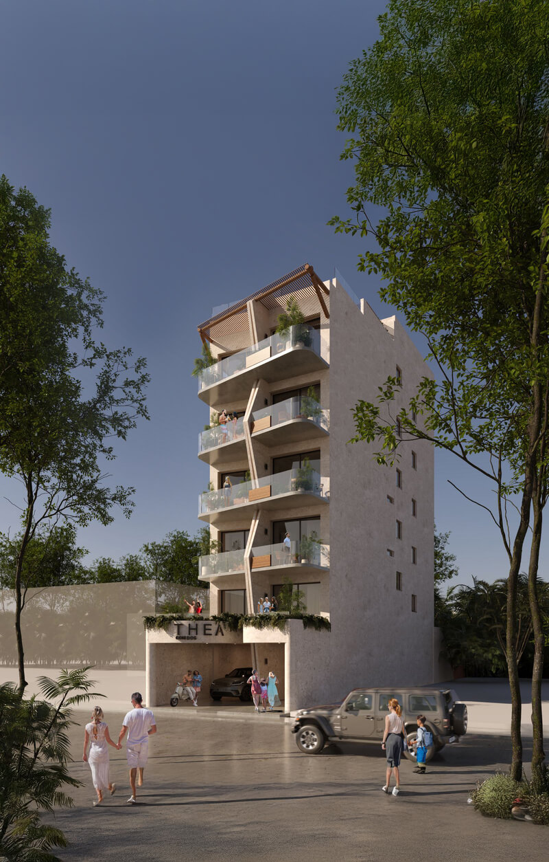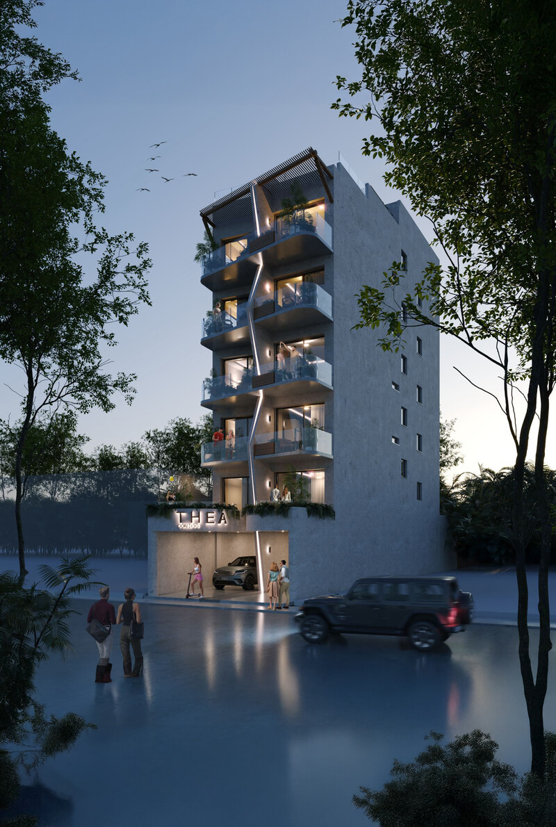 Thea Condos is a five-level residential building located in Puerto Morelos, Quintana Roo. The project includes 12 condominiums and is scheduled for delivery in 2025. The location is 15 minutes from CancĂșn Airport and the future Mayan Train station.
