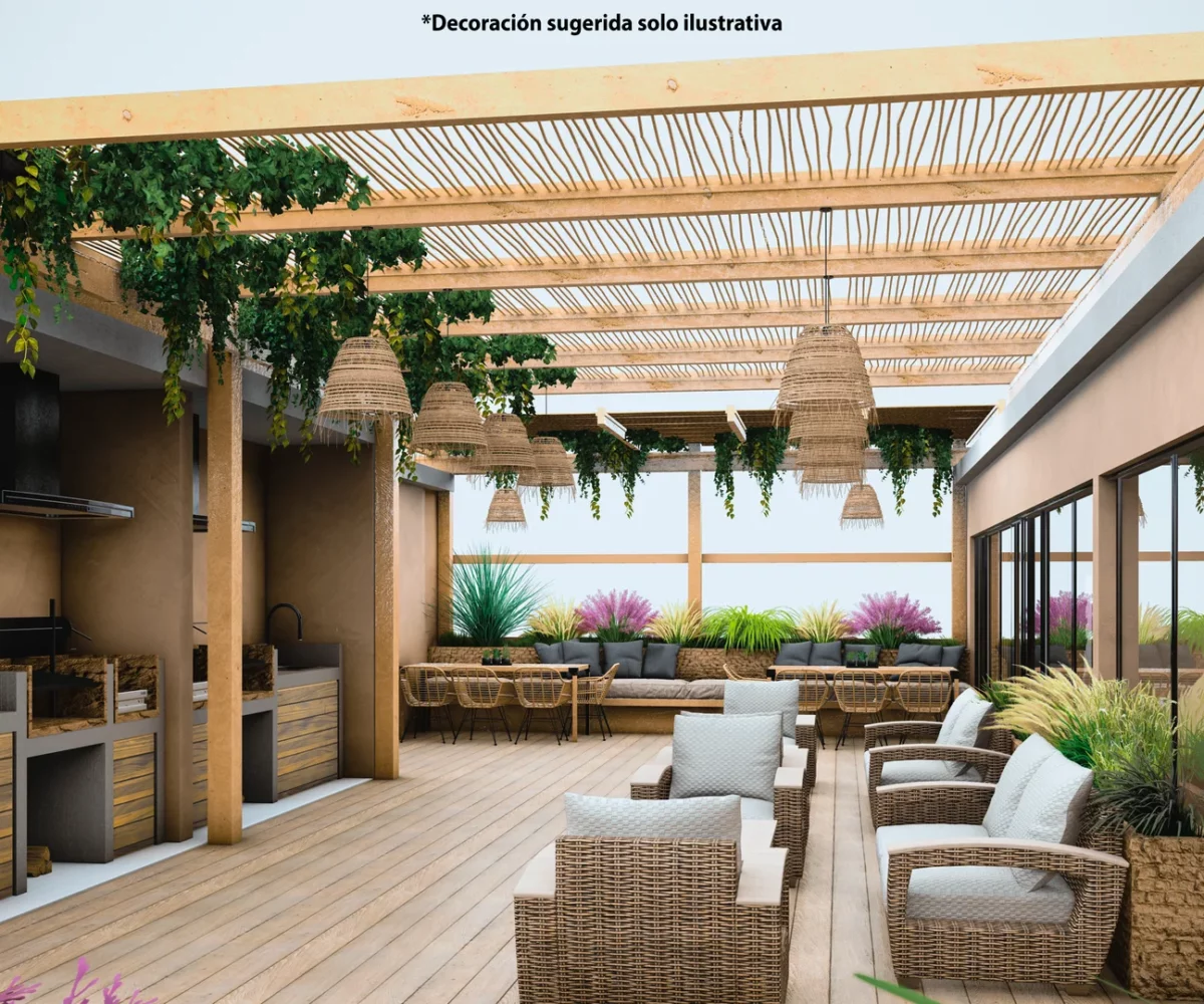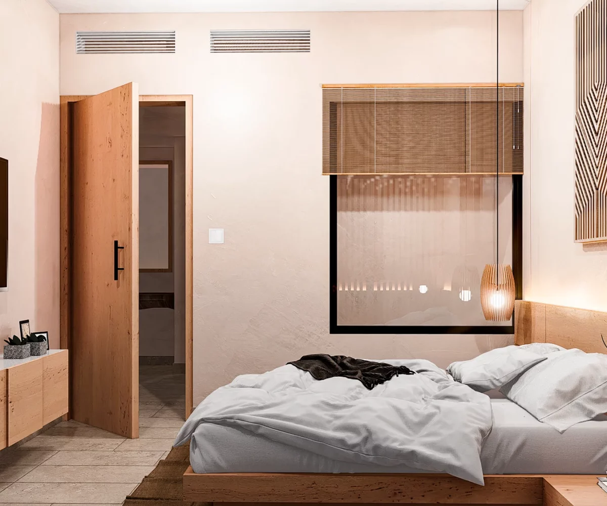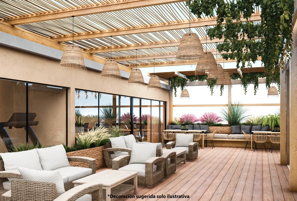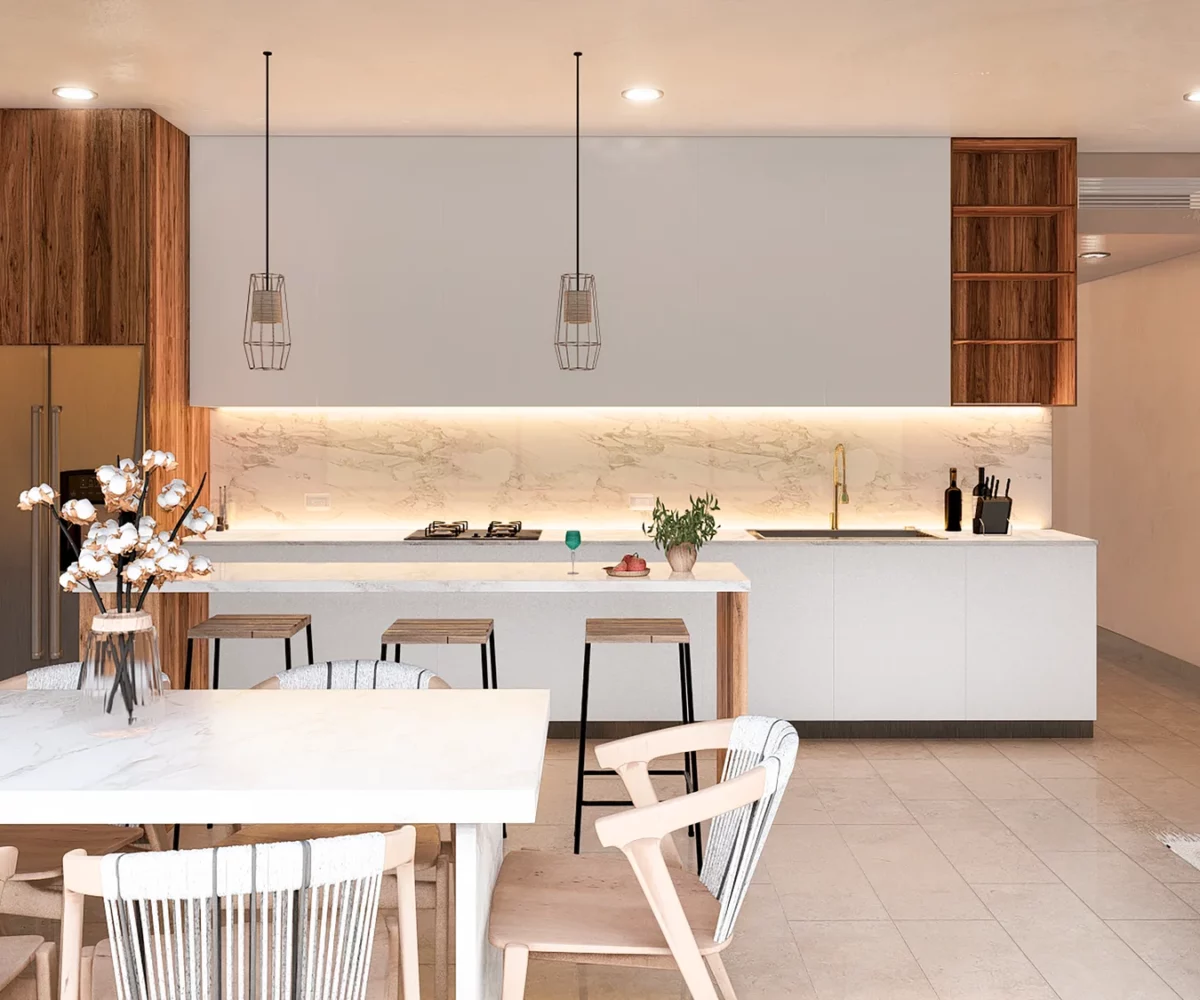 The architectural style blends warm wood tones with neutral finishes and large windows that maximize natural light. Interiors are practical and efficient, aligned with current buyer demand in Playa del Carmen’s residential market.